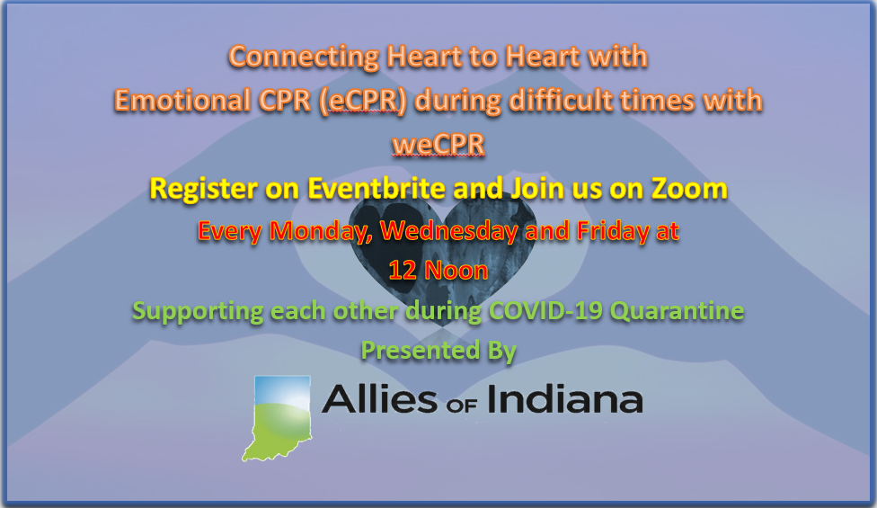 Join us for a FREE 60 minute virtual ZOOM weCPR session sponsored by Allies of Indiana which will focus on self-care especially during these challenging and fearful times as we battle COVID-19 in the United States and Globally. During our time together we will check in with each other, support each other and share strategies of self-care. We ask that you bring your favorite beverage (non-alcoholic) and find a quiet place to connect with the group.