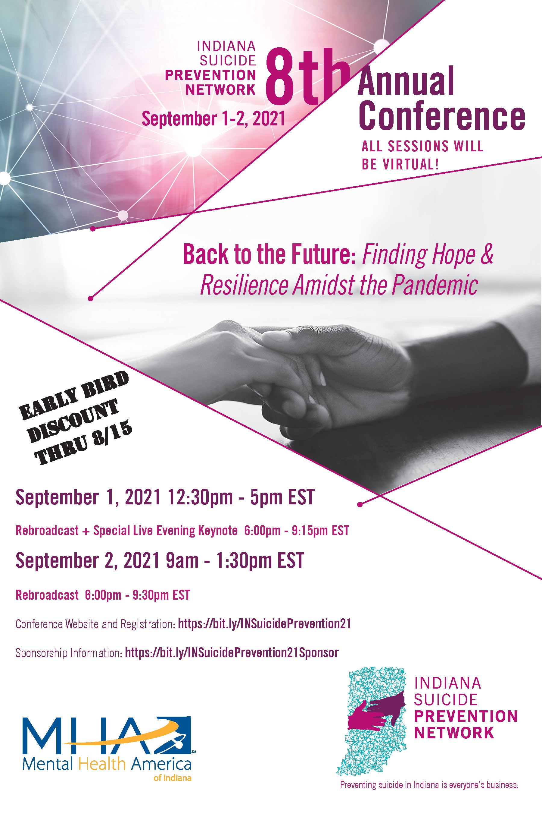 Registration is now open – with an Early Bird Discount – for the Indiana Suicide Prevention Network’s 8th Annual Indiana Suicide Prevention Conference – Back to the Future: Finding Hope & Resilience Amidst the Pandemic.